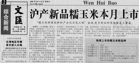 作为我国特有的种质资源,糯玉米口感独特,被誉为保健黄金食品。2001年起,上海市农科院专家利用现代生物技术相继培育出“沪玉糯2、3号”两个优质、高产、多抗的糯玉米新品种,目前分别在南汇、崇明两地建立了1千和2千亩绿色生产基地。经农业部谷物检测中心测定,“沪玉糯2、3号”的糯性淀粉含量双双超过99%。