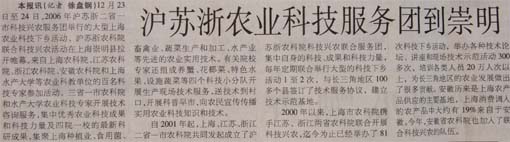 12月23日至24日,2006年沪苏浙二省一市科技兴农服务团举行的大型上海农业科技下乡活动、沪苏浙农科院联合科技兴农活动在上海崇明县拉开帷幕。来自上海农科院、江苏农科院、浙江农科院、安徽农科院和上海水产大学等农业科教单位的百名科技专家参加活动。三省一市农科院和水产大学农业科技专家开展技术咨询服务,集中优秀农业科技成果和科技力量及四院一校的最新科研成果,集聚上海种植业、食用菌、畜禽业、蔬菜生产和加工、水产业等先进的农业实用技术。有关院校专家还组成养蟹、花椰菜、特色水果、设施蔬菜等四个科技小分队开展生产现场技术服务,送技术到村口,开展科普早市,向农民宣传传播实用农业科技知识和技术。