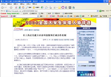 长三角三地的主要农业科技机构已建立了区域合作机制,以资源共享、优势互补和人才共用协调区域农业发展。苏浙沪三地的农业科学院六年前就发起建立了区域科技兴农联合服务团,整合各自的科研力量,每年定期联合实施“科技下乡”,与长三角地区100多个县签订了技术服务协议,建立技术示范基地。据统计,每年平均有几十批农业科技人员分赴基地进行技术指导和技术培训。