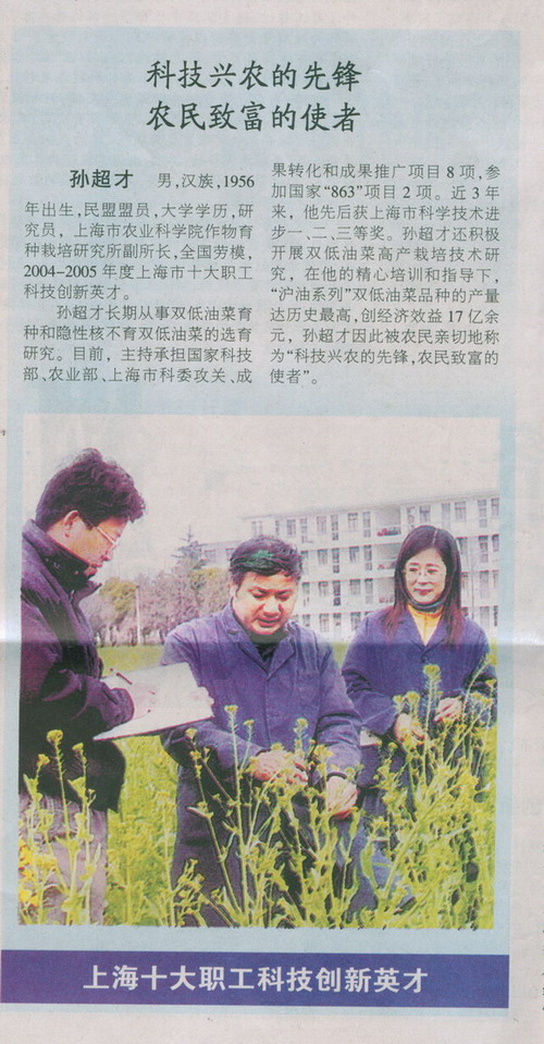 孙超才 男,汉族,1956年出生,民盟盟员,大学学历,研究员,上海市农业科学院作物育种栽培研究所副所长,全国劳模,2004—2005年度上海市十大职工科技创新英才。