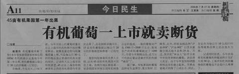 据农科院林果所负责人介绍,这块45亩的有机果园不仅在上海,在南方地区都是第一家获得国家环保总局有机转换认证的基地,一般的葡萄亩产在1500斤—2000斤左右,基地生产的有机葡萄超过了1200斤.尽管今年刚刚出品,近万公斤的供应量还是被市民的热情“淹没”了。