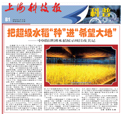 在寓意“东方之冠,天下粮仓”的上海世博会中国国家馆49米层名为“希望大地”的 9平方米展区里,你可以看到禾叶青青、谷穗已泛金黄的活体超级水稻,正呈现出一派生机勃发的景象,这不要说一般的游客连连称奇,就连水稻老行家们也觉得太不可思议了。