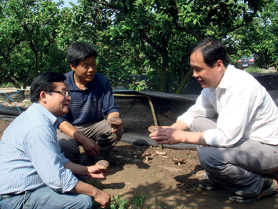 这是上海市科委关于崇明生态岛建设的一个攻关项目。上海市农科院专家针对崇明县绿华镇以柑橘种植为主的特点,利用橘树空隙地栽培食用菌,以提高果农的经济效益。科技人员根据不同树龄、林下不同的郁闭度搭建环棚,覆盖遮阴材料,选择适合林地栽培的品种,如高温香菇、鸡腿菇、长根菇和猪肚菇等。当地种植户高兴地说,食用菌在橘树下种植,第一次栽培就取得了成功,产量很高,前两天阴雨,更是长得特别快,稍不抓紧采,就会长得太大了。等到一茬茬采摘完,栽培后剩下的培养料也不用再另外处理,就直接作为橘树的有机肥料。林下栽菇,立体种植,真是一举多得。
