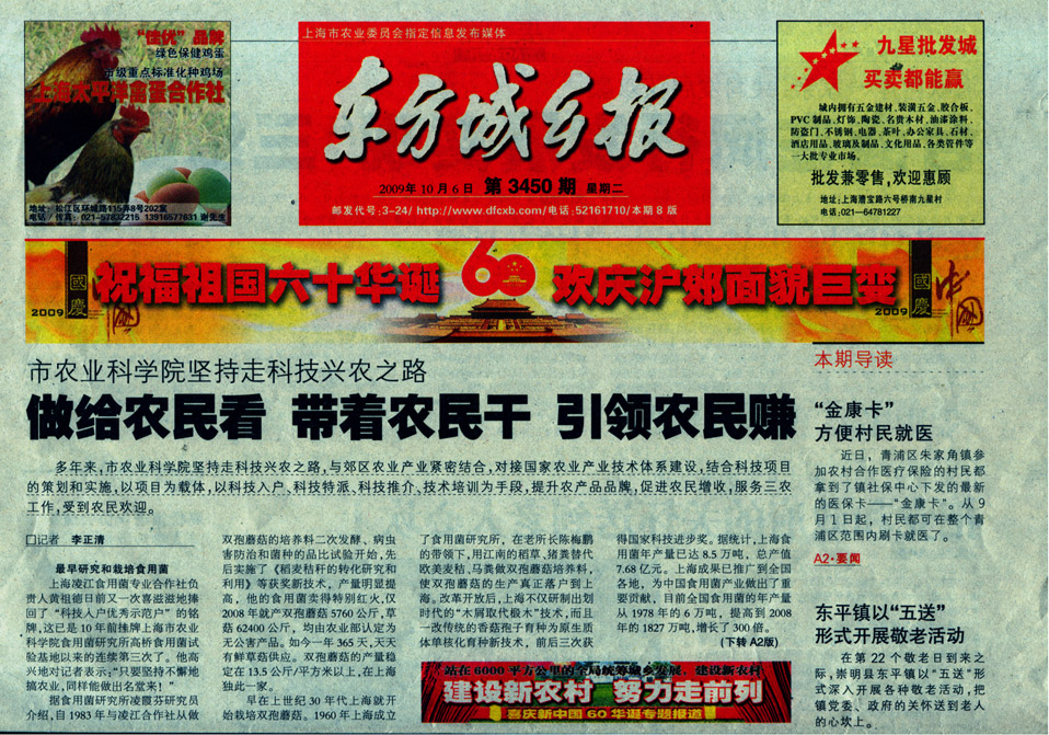 早在上世纪30年代上海就开始栽培双孢蘑菇。1960年上海成立了食用菌研究所,在老所长陈梅鹏的带领下,用江南的稻草、猪粪替代欧美麦秸、马粪做双孢蘑菇培养料,使双孢蘑菇的生产真正落户到上海。改革开放后,上海不仅研制出划时代的“木悄取代椴木”技术,而且一改传统的香菇孢子育种为原生质体单核化育种新技术,前后三次获得国家科技进步奖。据统计,上海食用菌年产量已达8.5万吨,总产值7.68亿元。上海成果已推广到全国各地,为中国食用菌产业做出了重要贡献,目前全国食用菌的年产量从1978年的6万吨,提高到2008年的1827万吨,增长了300倍。