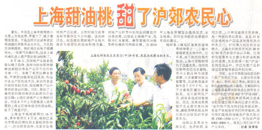 6月16日,国家桃产业体系包括从桃子品种、栽培与综合管理到病虫害防治等各产业环节在内的专家一行,考察了奉贤区鲜食黄桃、早熟甜油桃等桃园现场,和全市各主产区的技术员、果农代表进行面对面的交流,现场解答产业中存在的突出问题。同时,参加了上海市农科院和奉贤区政府召开的迎世博——上海优质桃产业发展研讨会。对在6月中上旬就能进入盛果期的上海自行培育成功的甜油桃,给予了高度评价。