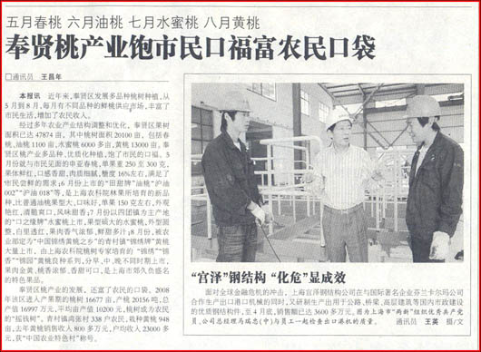 奉贤区桃产业的发展,还富了农民的口袋。2008年该区进入产果期的桃树16677亩,产桃20156吨,总产值16997万元,平均亩产值10200元,桃树成为农民的“摇钱树”。青村镇湾张村338户农民,栽种黄桃948亩,去年黄桃销售收入800多万元,户均收入23000多元,获“中国农业特色村”称号。