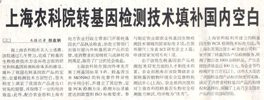 据上海农科院有关人士透露,该院通过几年努力,完成了转基因生物检测技术方法标准方面的研究和转基因检测标准体系的建设,填补了我国在转基因农产品的定性、定量检测技术方面空白,很大程度上满足我国农产品进出口贸易的需要,并取得了一定的经济效益;此外,配合农业部和上海市地方农业行政主管部门开展转基因农产品执法检查,协助主管部门加强对国内外转基因农产品的监管,使消费者的知情权与选择权得到满足,取得了广泛的社会效益。