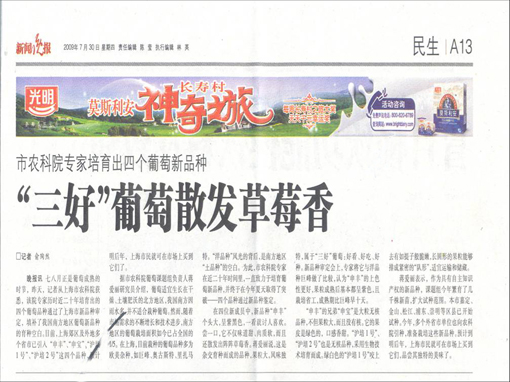 七八月正是葡萄成熟的时节,昨天,记者从上海市农科院获悉,该院专家历时近二十年培育出的四个葡萄品种通过了上海市新品种审定,填补了我国南方地区葡萄新品种的育种空白。目前,上海郊区及外地多个省市已引入“申丰”、“申宝”、“沪培1号”、“沪培2号”这四个品种,预计明后年,上海市民就可在市场上买到它们了。