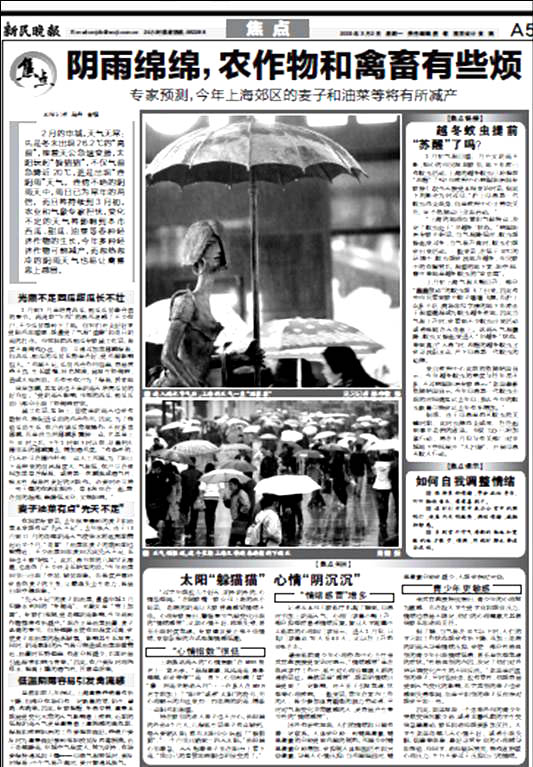 2月的申城,天气无常:先是冬末出现26.2℃的“高温”,接着天公急速变脸,太阳玩起“躲猫猫”,不仅气温急降近20℃,更是出现“连阴雨”天气。连绵不绝的阴雨天中,雨日已为常年的两倍,而且将持续到3月初。农业和气象专家担忧,变化不定的天气将影响到本市西瓜、甜瓜、油菜等春种经济作物的生长,今年多种经济作物可能减产,而忽热忽冷的阴雨天气也易让禽畜患上感冒。