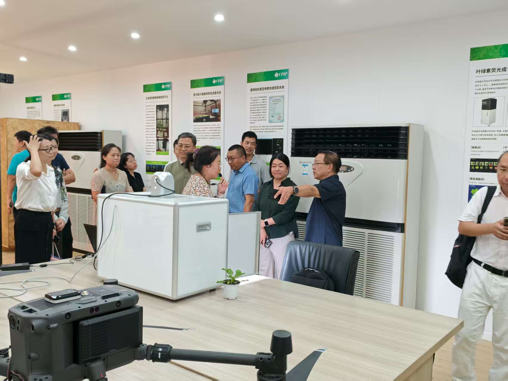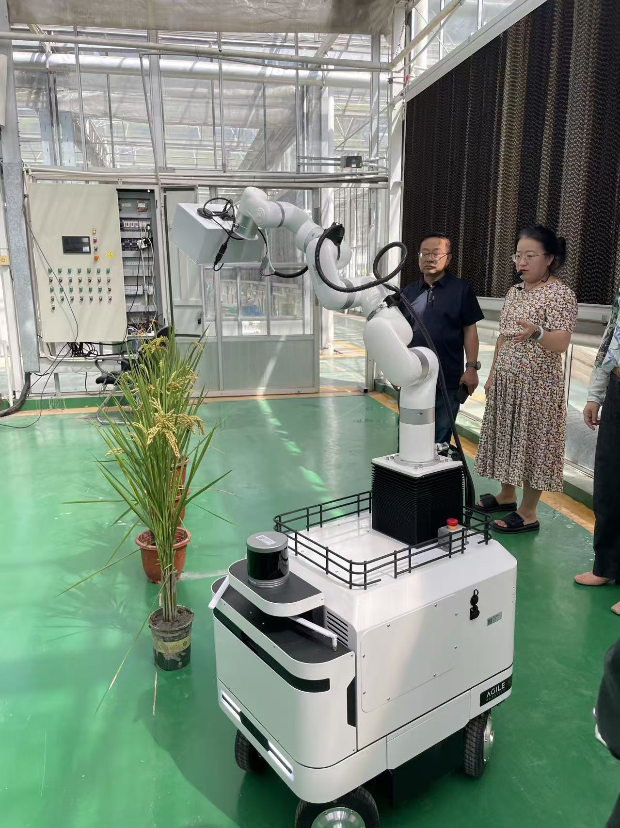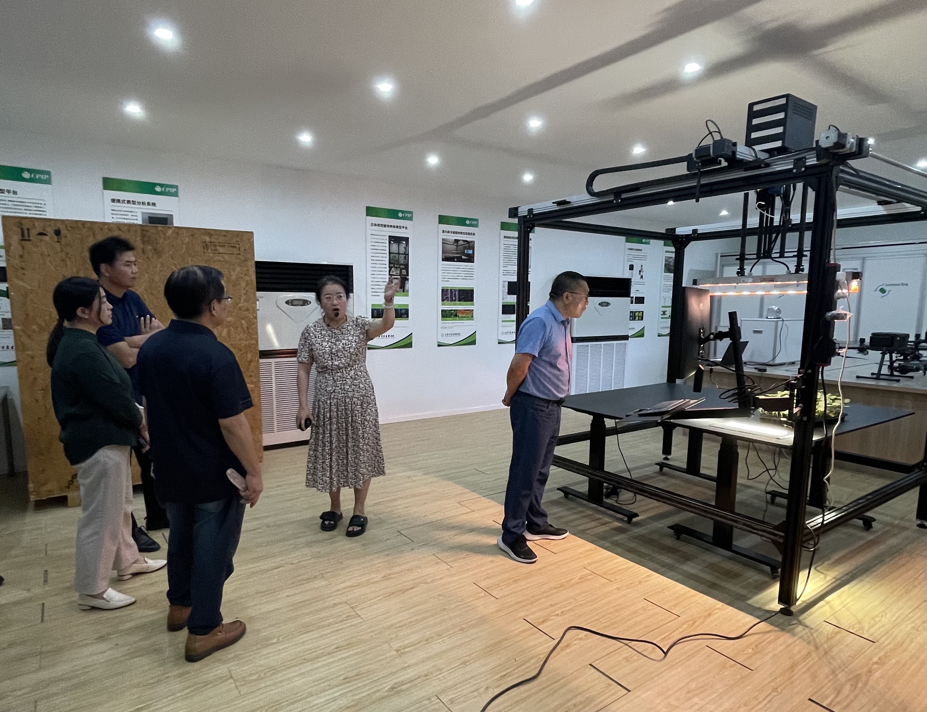 专家组查看了课题实施现场,田明璐副研究员展示了课题组研发成果,对无人机表型平台、温室吊轨表型平台、田间行走表型机器人、实验室小型表型分析设备和田间试验便携式表型分析等设施的运行情况进行了演示和汇报。