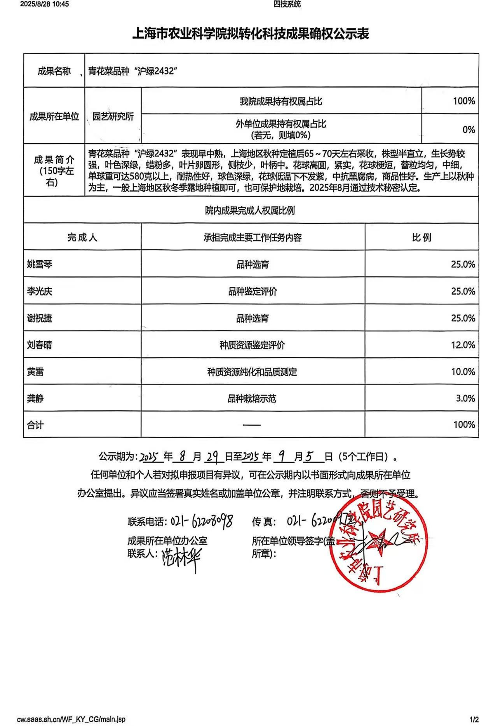 上海市农业科学院拟转化科技成果确权公示表